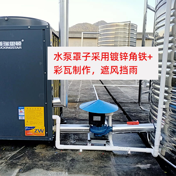 2、在员工宿舍安装:2台5匹空气能热泵,2个5吨水箱,2台空气能循环泵,1套变频加压供水系统,控制系统1套,沐浴间管道及配件1批,混水阀花洒56套等。